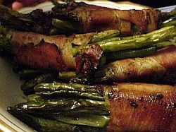 Inzwischen die grünen Bohnen von den Spitzen befreien. waschen und einige Minuten in kochendem Wasser blanchieren. Die noch leicht festen Bohnen mit Schwarzwälder Schinken portionsweise (jew. 5..8 Stck.) fest umwickeln und in einer Pfanne mit heißem Olivenöl von allen Seiten anbraten. bis der Schinken goldgelb und cross ist.