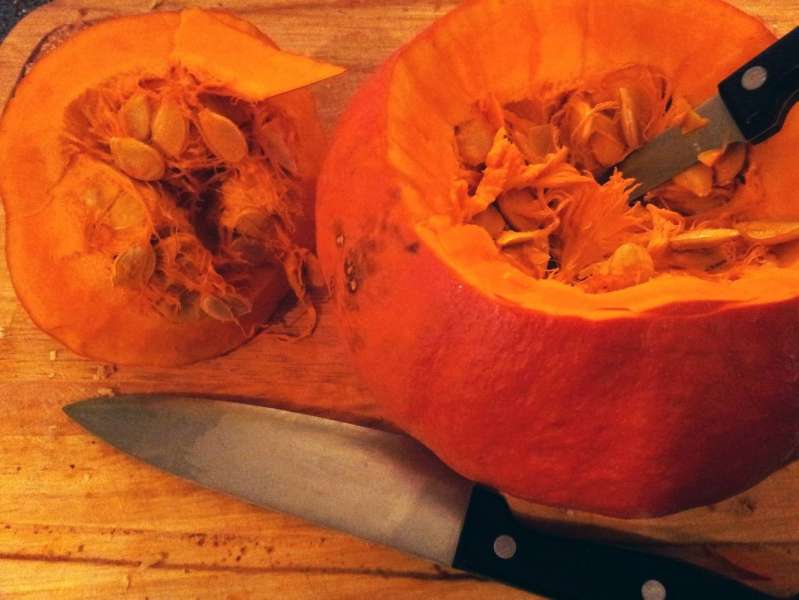 Den Kürbis in einer Auflaufform im Ofen bei 200°C 1,5 bis 2 Std. garen. Er ist fertig, wenn das Kürbisfleisch zart ist (Gabeltest).