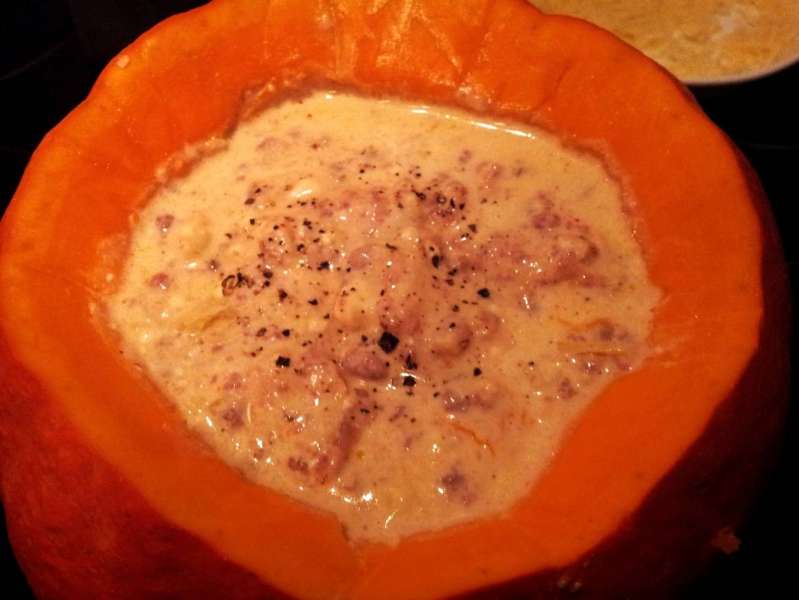 Die heiße crème in den Kürbis füllen, Käse und Fleisch dazugeben und unterrühren. Pfeffern, salzen.