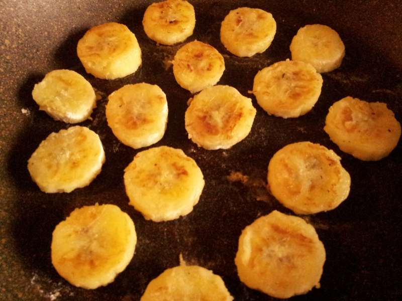 Die Bananen in Scheiben schneiden und in Mehl wälzen. In wenig heißem Fett ausbacken, bis das Mehl leicht Farbe bekommt.