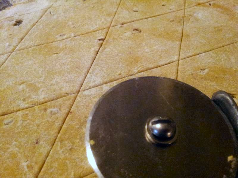 Nun ordentlich Mehl auf die Arbeitsfläche, an die Hände und an die Rolle und den Teig hauchdünn ausrollen, zu Dreiecken schneiden (erst parallele Diagonalschnitte, dann noch einmal spitzwinklig dazu, dann die entstandenen Rauten halbieren; Pizzarollmesser)
