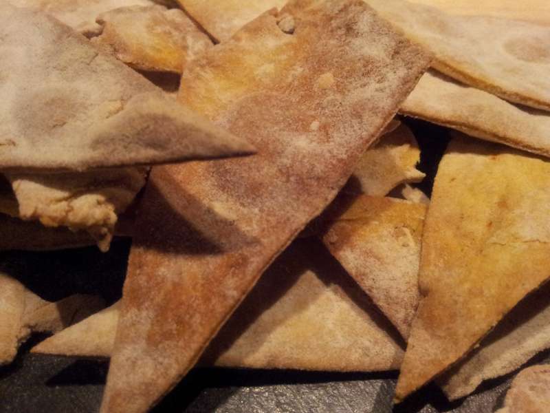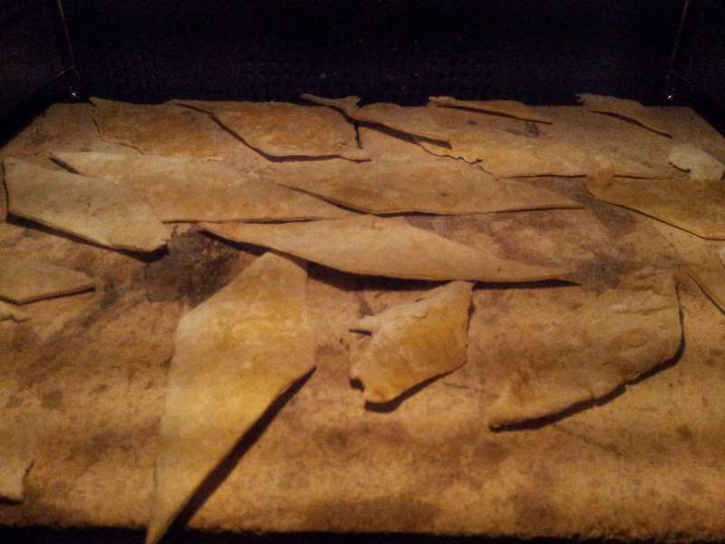 Die Dreiecke mit der Gabel mehrfach einstechen (um Blasenbildung zu vermeiden), auf ein mit Backpapier ausgelegtes Backblech legen und im vorgeheizten Herd bei 240 °C etwa 5 Minuten backen.