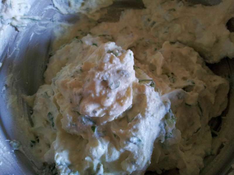 Basilikum hacken, Ziegenkäse mit der Gabel zerdrücken und mit dem Frischkäse in einer Schüssel gut durchmischen. Mit dem Pfeffer abschmecken.