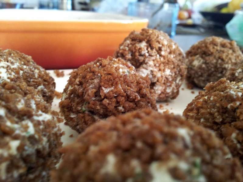 Daraus Kugeln formen und diese in den Pumpernickelbröseln wälzen, bis sie gut und dicht umschlossen sind. Ggf. etwas andrücken.