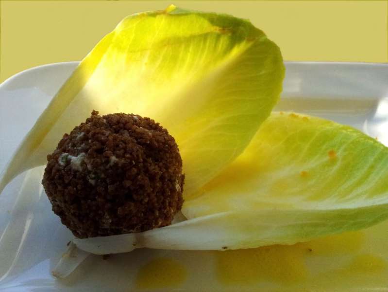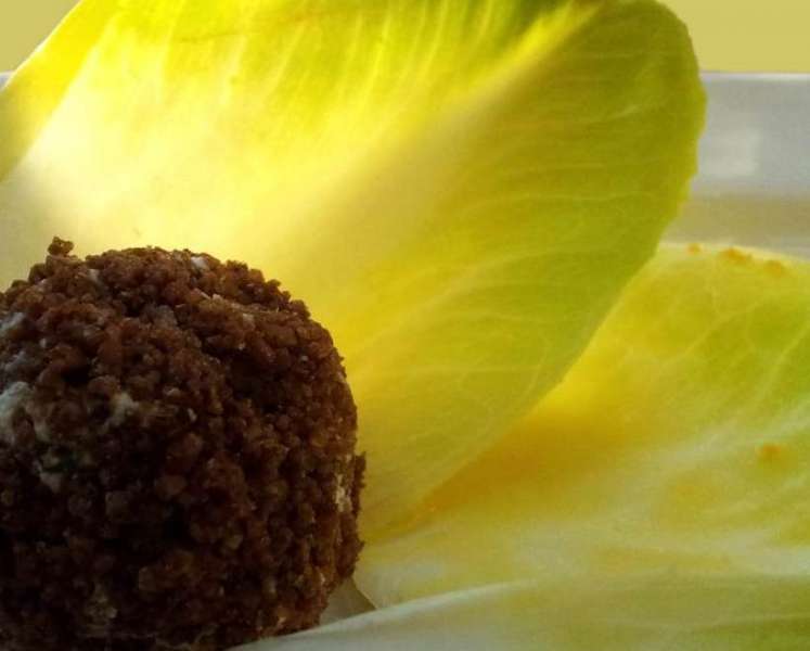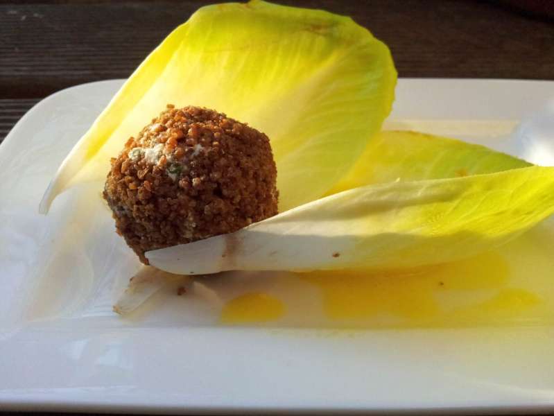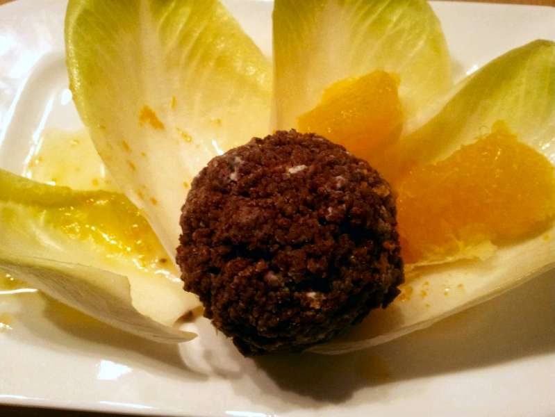 Die Blätter durch die Vinaigrette ziehen und auf einen Teller legen. Je eine Praline in ein Chicorée-Schiffchen setzen. Davon 2..3 pro Portion. Etwas Vinaigrette um die Schiffchen drumherum träufeln und die Orangenfilets dazwischen legen.