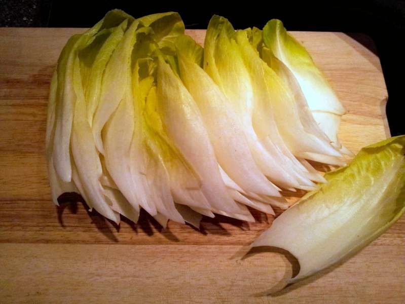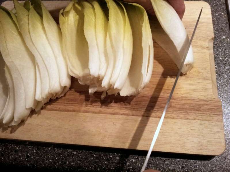 Die Blätter der Chicorée-Rosette einzeln auf die lange Seite legen und schräg den hinteren dicken (bitteren) Blattanteil wegschneiden.