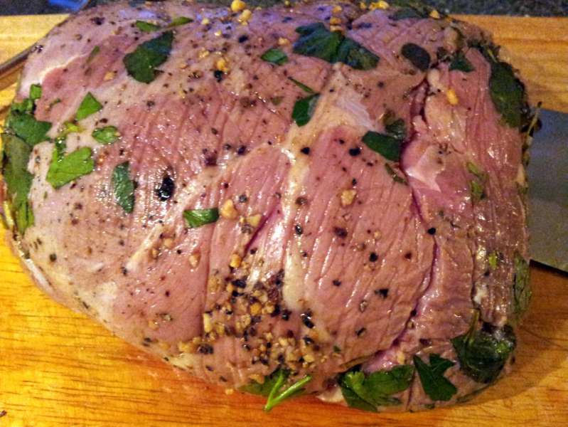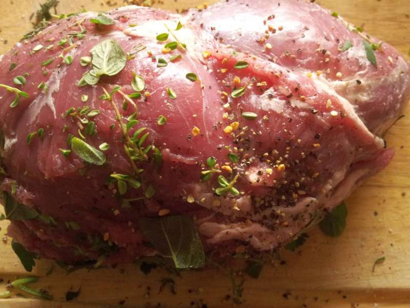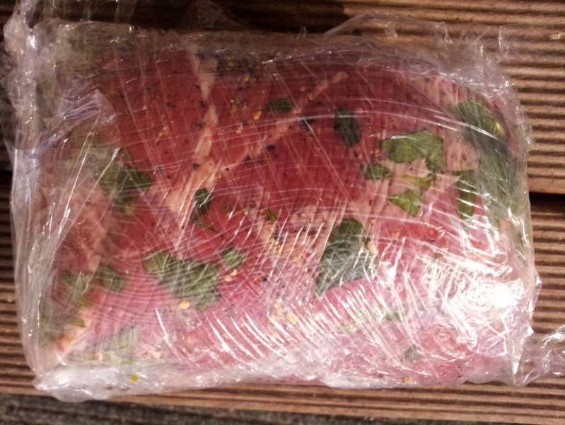 Das Fleisch von der Decke befreien, ggf. Sehnen entfernen, mit Salz und Pfeffer kräftig würzen. Die Kräuter ins Innere der Keule geben, diese in Form bringen, dass eine möglichst gleichmäßige Kugel oder Walze entsteht (wegen der gleichmäßigen Garung).