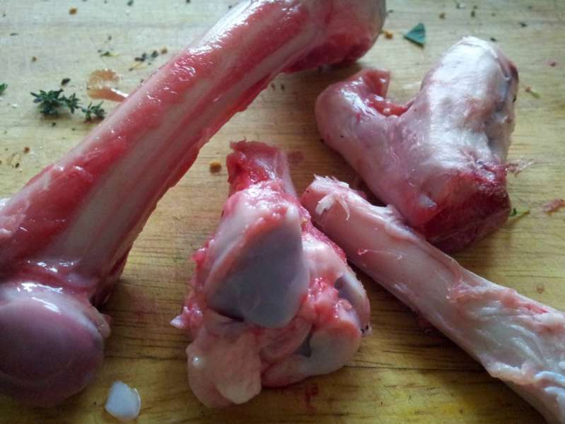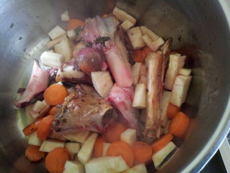 Die Knochen aufschlagen und in Olivenöl anrösten. Möhren und Sellerie in Stücke geschnitten mit anbraten. Zwiebel hinzufügen, später den kleingeschnittenen Knoblauch. Mit dem Zucker bestreuen und diesen karamellisieren lassen.