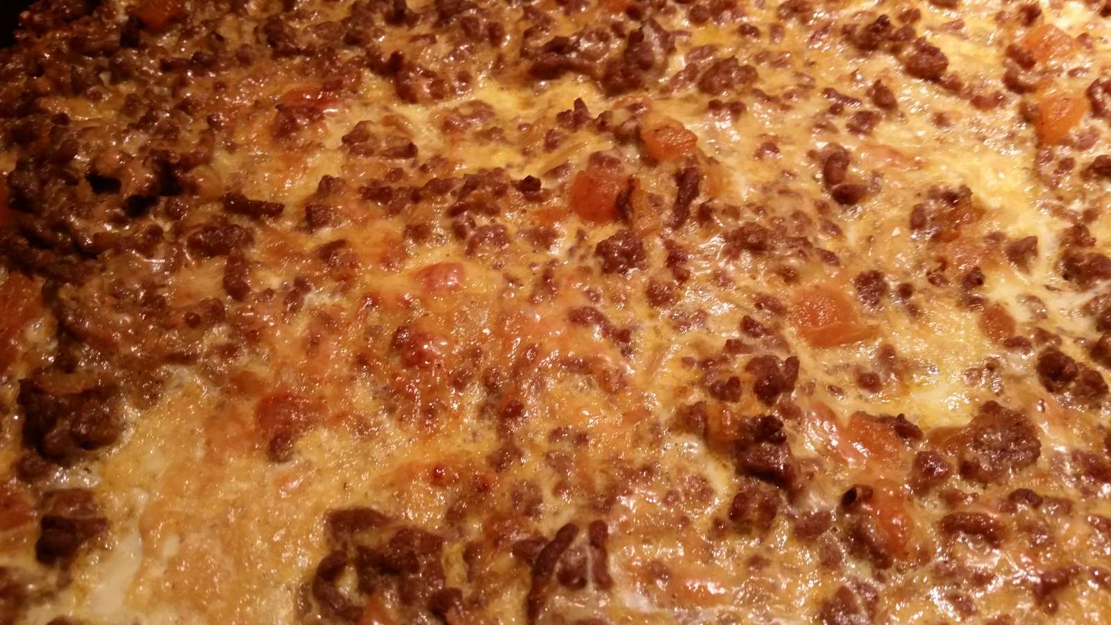 Die Hackmischung in eine passende Auflaufform geben, Ei-Milch-Mischung darüber gießen und den geriebenen Käse gleichmäßig über dem Auflauf verteilen.