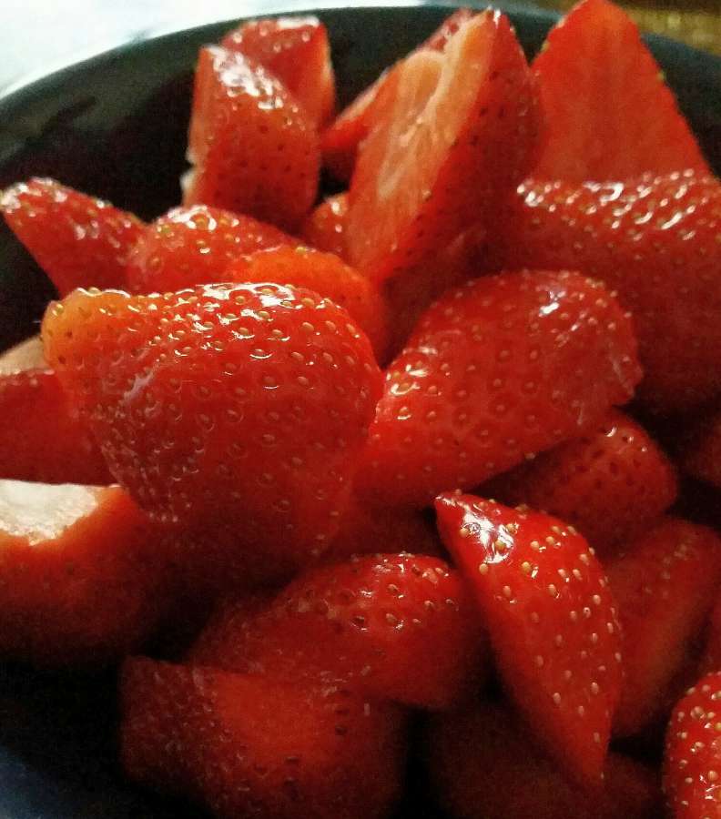 4 kleine Erdbeeren in jew. 3 Scheiben schneiden aber nicht miteinander vermengen. Die Erdbeeren sollen als Ganzes den Kern der Geleekugeln bilden, beim Hineinfahren mit dem Löffel/der Gabel aber zerfallen in charmantere Stückchen. Nach etwa 1 Std. sollte das Gelee so fest sein, dass man die Erdbeeren hineindrücken kann ohne dass sie bis zum Grund absinken.