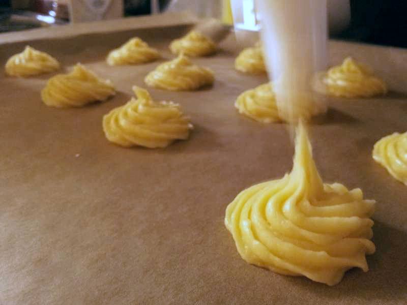 Backofen auf 180°C vorheizen. Backblech mit Backpapier auslegen. Mit einem Spritzbeutel die gewünschten Formen aufdressieren.