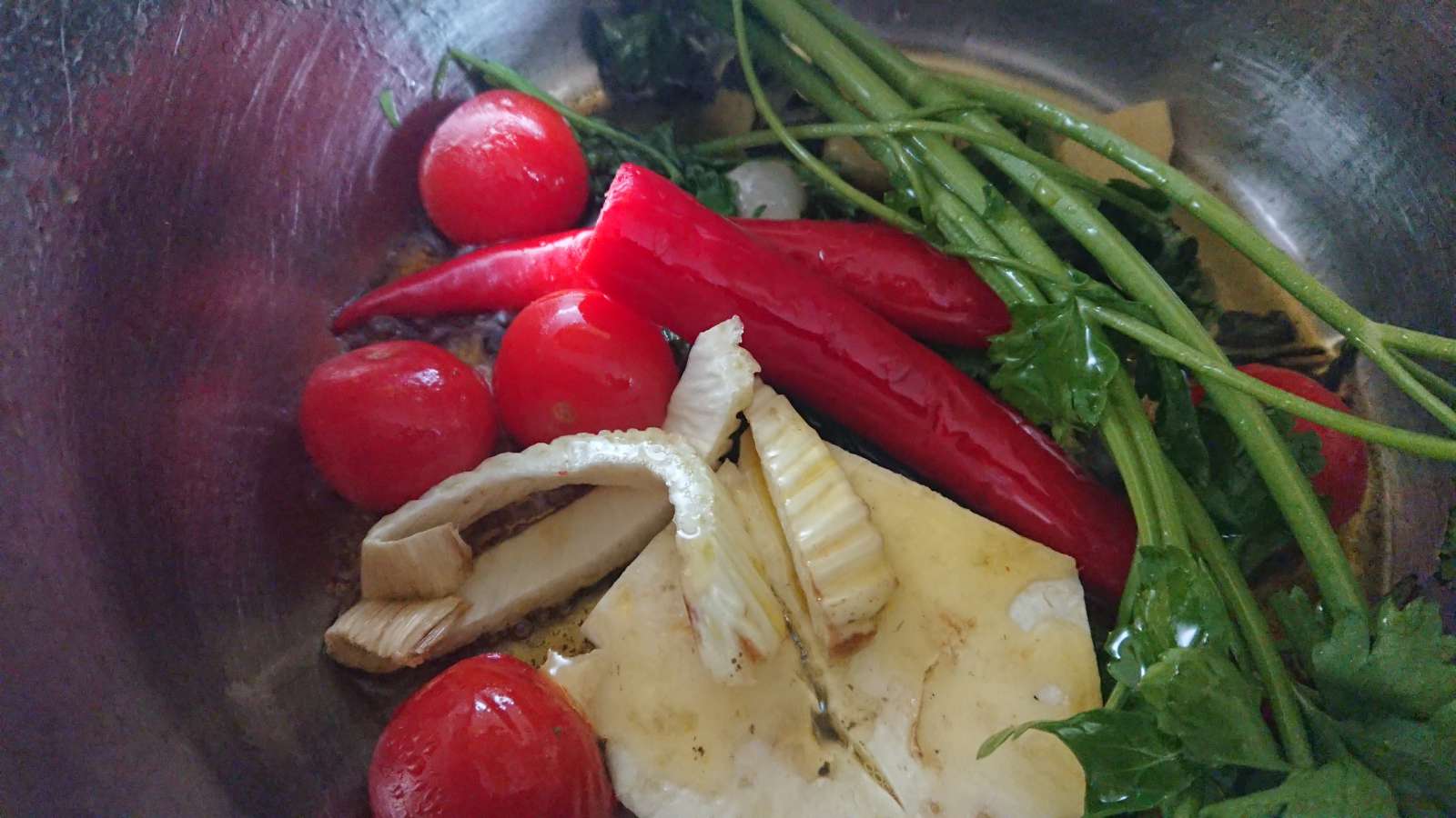 Tomaten, Tomatenmark, Sellerie (ggf. Fenchel und Frühlingszwiebel) in Olivenöl andünsten, später mit Wasser auffüllen.