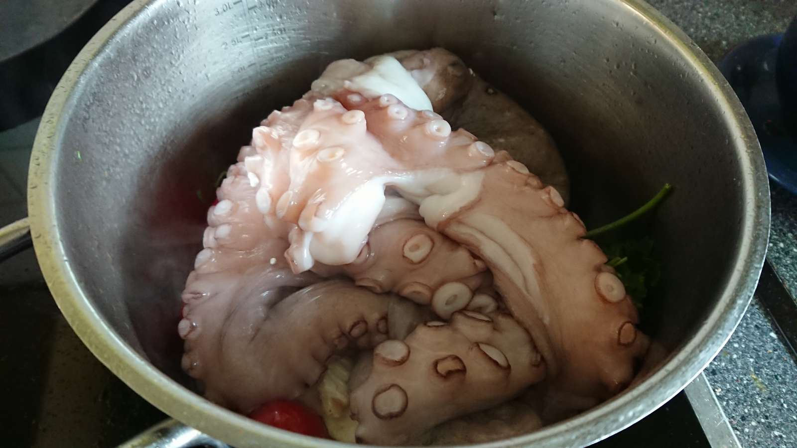 Beim Kochwasser kann völlig auf Salz verzichten werden, da der Pulpo sehr viel Flüssigkeit abgibt und er lebt nun mal im Meer.