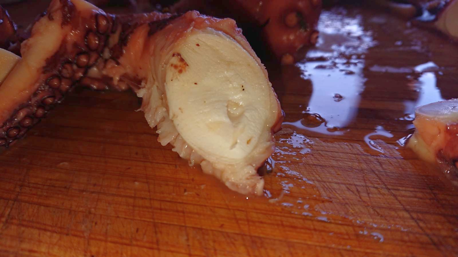 Fertig ist der Pulpo, wenn ein kleines Küchenmesser, besser ein spitzer Holzstab (Zahnstocher, Schaschlikspieß) leicht und ohne Widerstand eindringt.