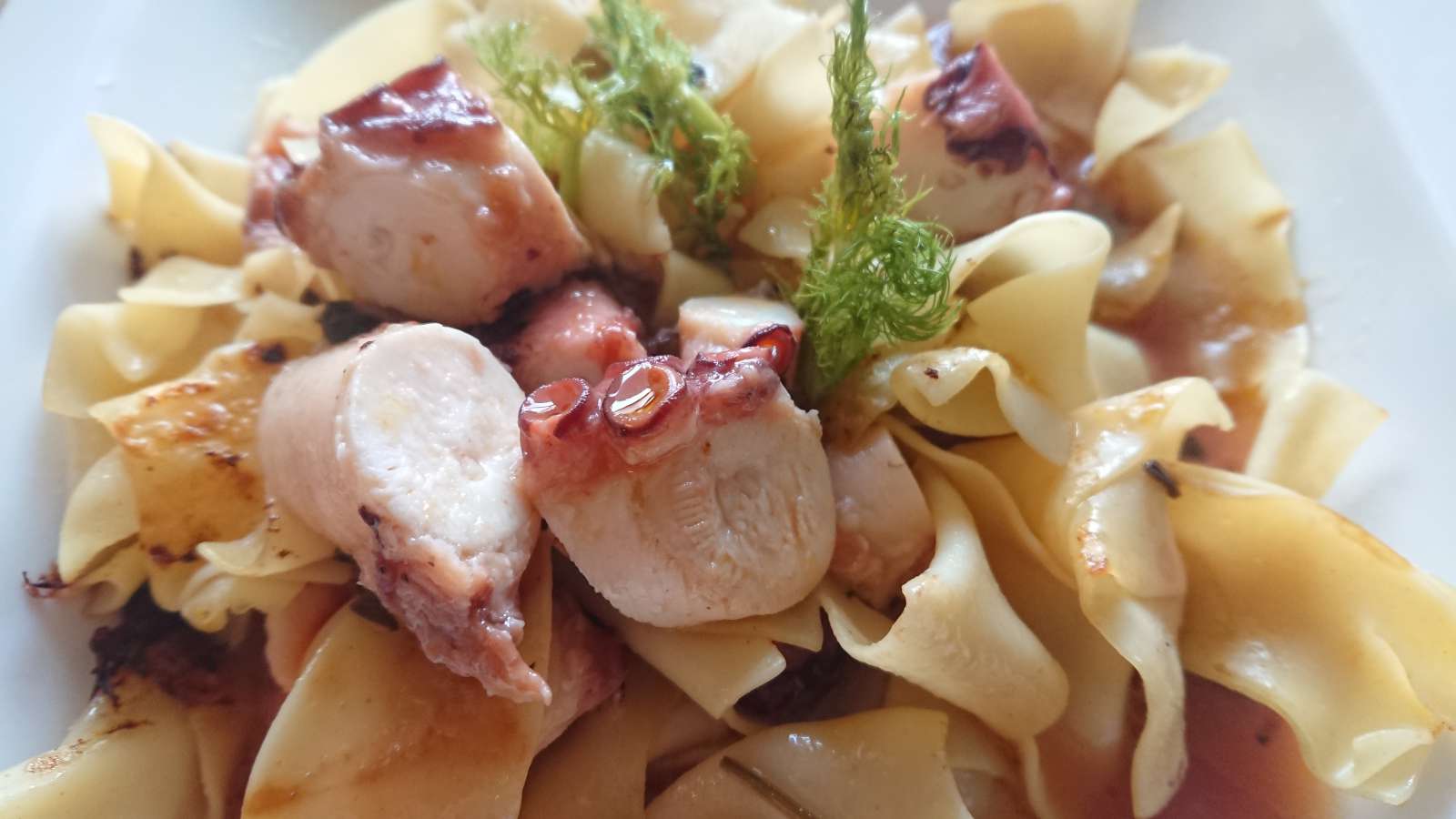 Den Pulpo in mundgerechte Stücke teilen und auf Nudeln zusammen mit dem sehr würzigen Sud anrichten.