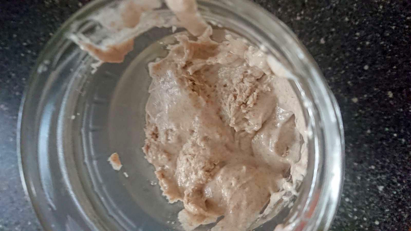 Nun davon 300g abzweigen, in ein Schraubglas geben und im Kühlschrank verwahren.