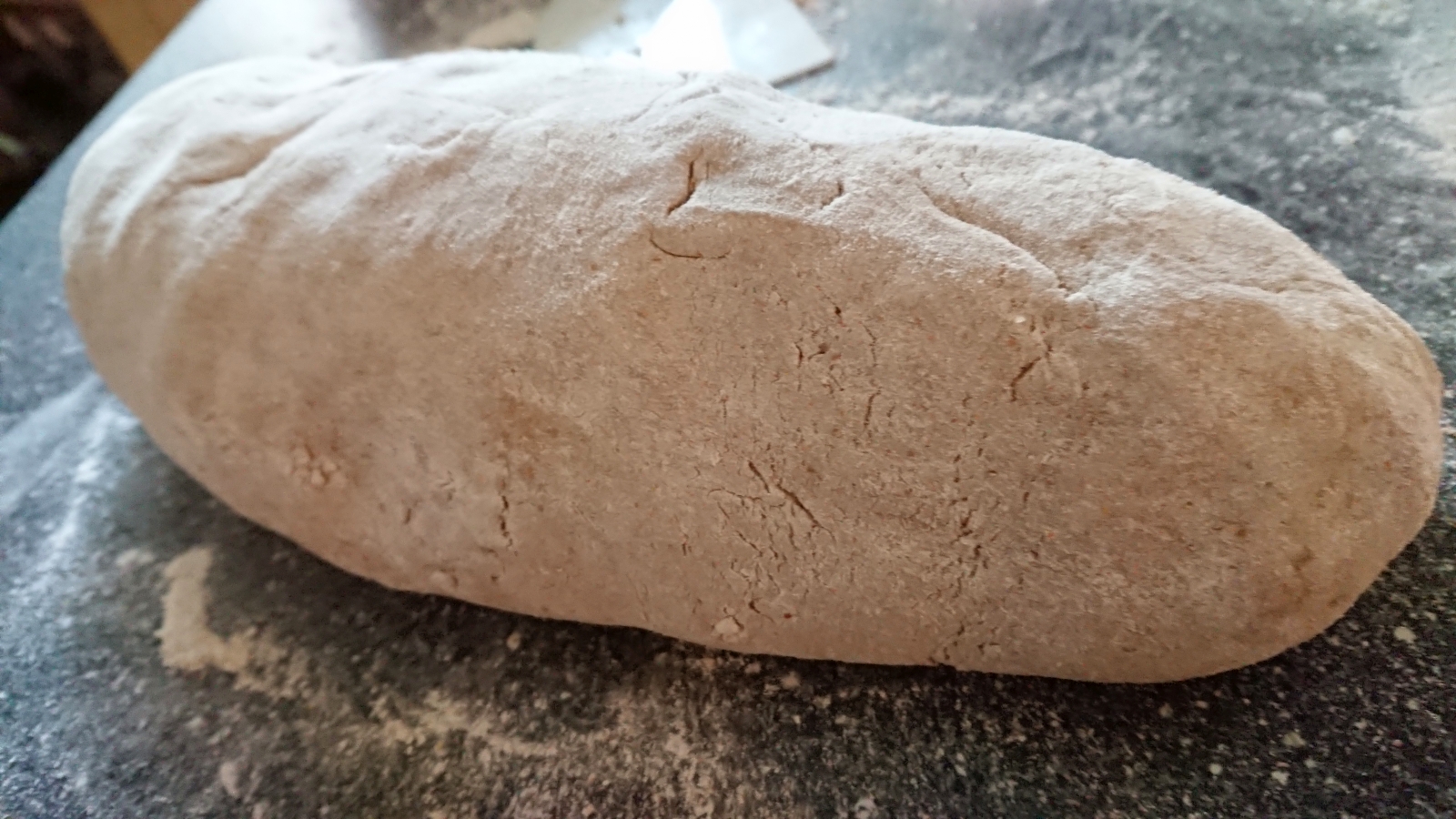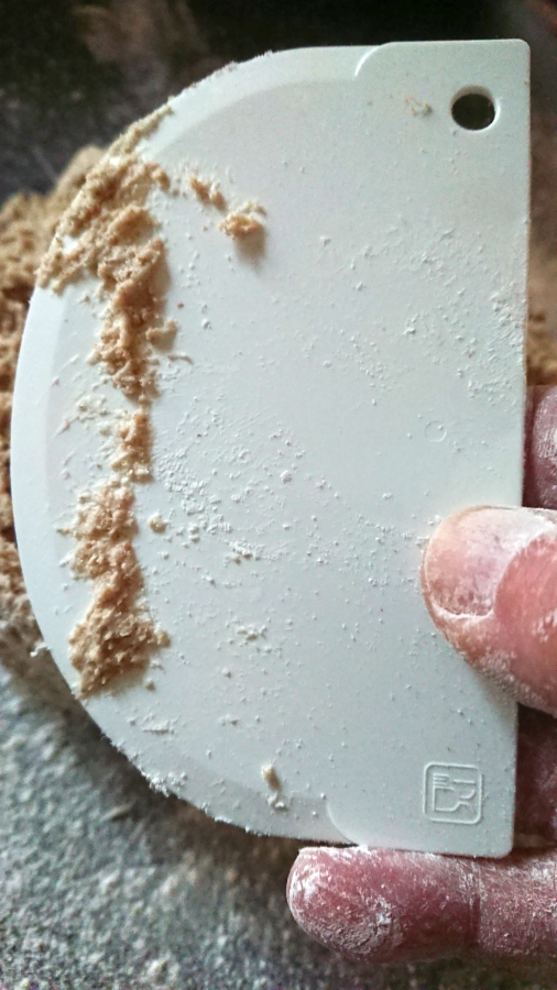 Die Arbeitsfläche großzügig mit Mehl bestreuen, die Hände damit bedecken und abklopfen. Den Teig aus der Schüssel auf die Arbeitsfläche geben, zu einem großen länglichen Leib formen und die bevorzugte Brotgröße mit dem Teigschaber abstechen. (Brauchen wir hier nicht bei unserm kleinen 1kg-Brot oder wir backen Roggenbrötchen.)