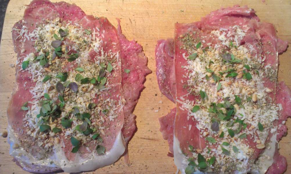 Kräuter waschen, trocken schütteln und klein hacken. Die Schnitzen teilen und zwischen Frischhaltefolie sehr dünn klopfen. Aus einem normalen Kalbsschnitzel bekommt man mind. zwei dünne. Salzen und pfeffern. Zwei Scheiben Parmaschinken auf ein Schnitzel legen. Mit kleingehackten Pinienkernen bestreuen und die Kräuter dazu geben. Die Involtini aufrollen und mit einem Zahnstocher feststecken.