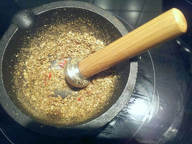 Im Mörser Fenchelsamen, Koriander, Oregano, Chillischoten zu einem Pulver zerreiben. Salz und Pfeffer untermischen. Die Konblauchzehe schälen, klein hacken und untermischen. Die Kräuterpaste mit Olivenöl und den Kürbisscheiben in eine Schüssel geben, Deckel drauf und kräftig mischen. Ziel: Alle Kürbisscheiben sollen mit der Kräutermischung bedeckt sein.