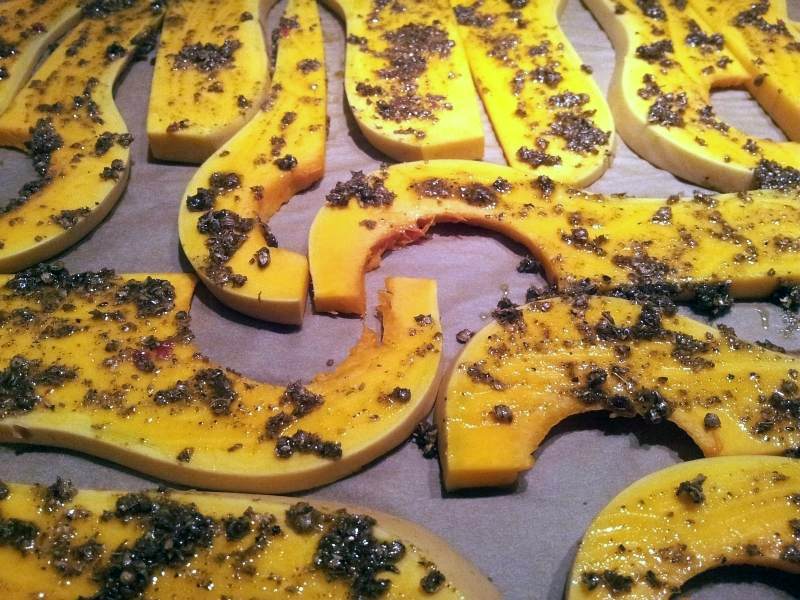 Ein Backblech mit Backpapier auslegen und die Kürbisscheiben darauf legen. Bei ca. 200°C im Ofen backen, bis der Kürbis weich ist. Dauer ca. 30-40 Minuten.