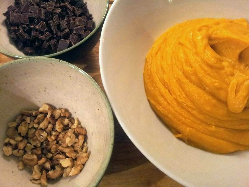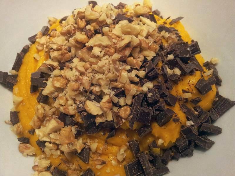 Schokolade und Nüsse klein hacken. Die Sahne mit dem Vanillezucker steif schlagen. Alles unter den erkalteten Kürbisbrei heben und zum Abkühlen in den Kühlschrank stellen (1-2 h).