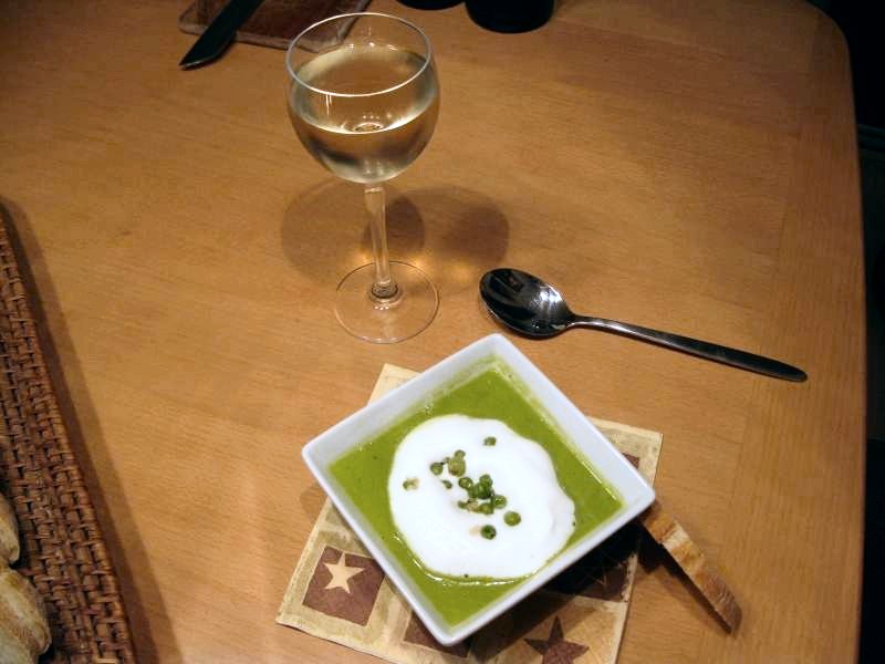 In der Zwischenzeit die Zwiebel schälen, klein schneiden und in Öl anbraten. Den Knobi dazu geben und alles andünsten. Die Erbsen dazugeben und einige Minuten mitdünsten, mit dem Gemüsefond auffüllen und garen. Dann die Erbsen pürieren, die Schlagsahne dazugeben und alles mit dem Pürierstab aufschäumen. Vor dem Pürieren einige Erbsen als Deko zurücklegen.