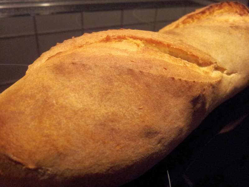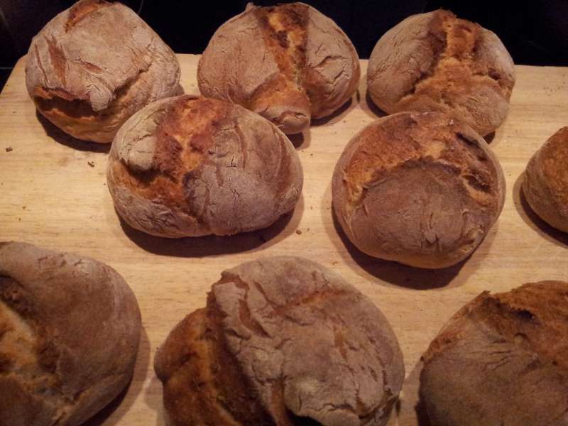 Weizensauer mit Zutaten vermengen und kneten, Brötchen, Brot, Weizen-Stange abstechen/abwiegen und formen, einschneiden, mit Mehl abstieben (auch und vor allem in den Schnitt).
