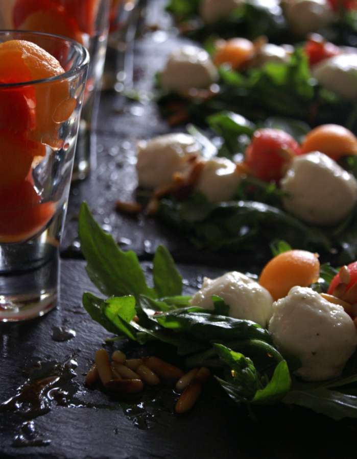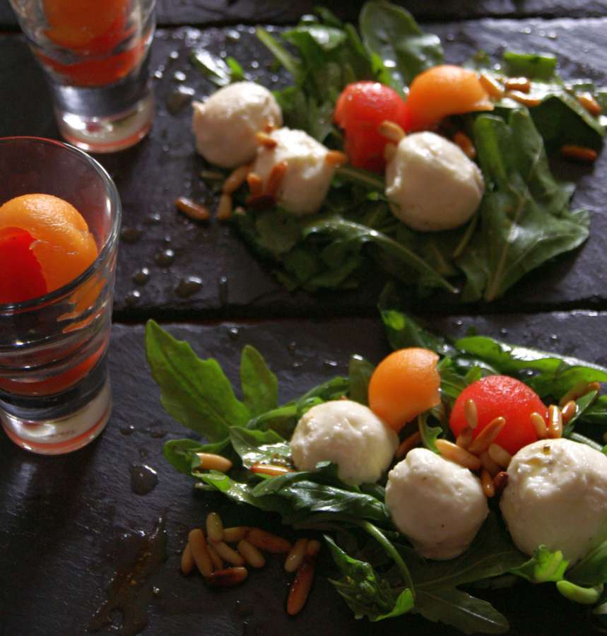 Den Frischkäse cremig rühren, ev. mit Milch auffüllen, damit das gut gelingt. Den Frischkäse nun portionieren mit Löffeln oder in der Hand rollen), in Gläser geben, Melonenspieße darauf legen und mit Pinienkernen bestreuen.