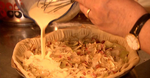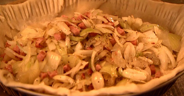 1 kg Gemüsezwiebel125 g magerer Speck, gewürfelt200 ml Schmand3 EierSonnenblumenölSalzgeriebene Muskatnuss3/4 Würfel frische Hefe375 g Mehl1 Kaffeetasse Milch1 TL Zucker