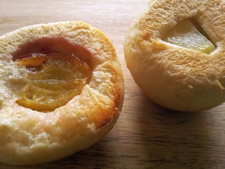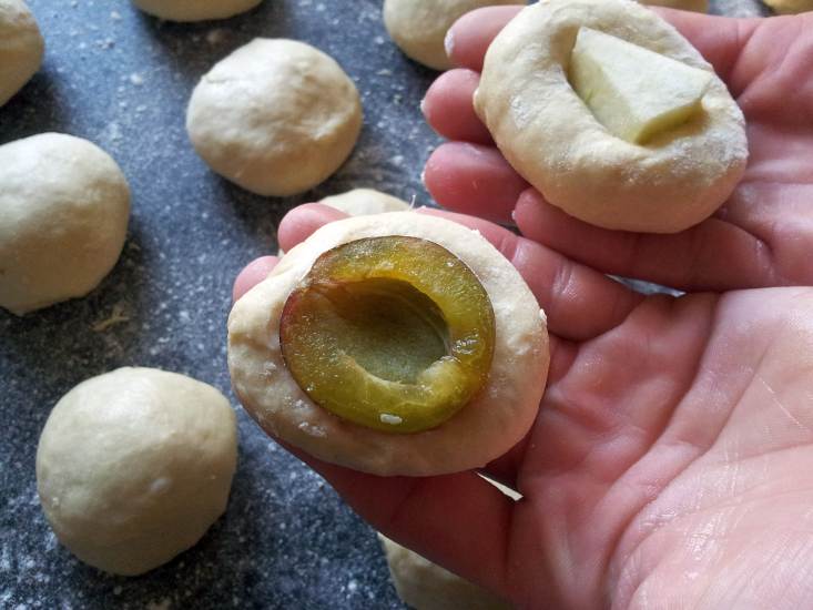 40g schwere Stücke portionieren und zu Kugeln formen. Falls man etwas fruchtiges backen will, jetzt die Fruchtstücke hinein drücken.