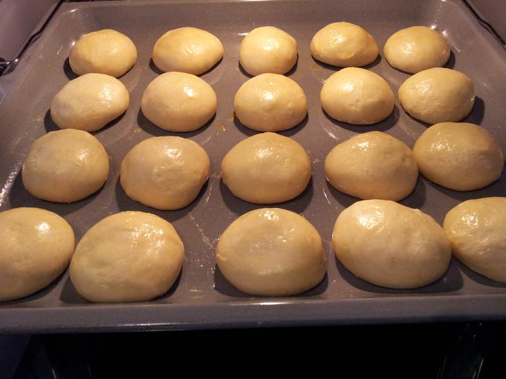 Teigstücke bei ca. 25°C..30°C und möglichst hoher Luftfeuchte abgedeckt etwa 30min gehen lassen.