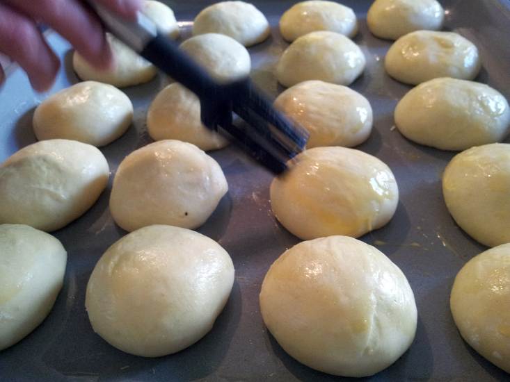 Ein verquirltes Ei mit einem Pinsel auf die Teigstücke auftragen (Teig abstreichen).