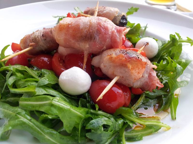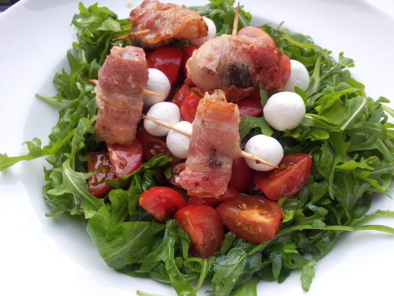 • eingewickelte Backpflaumen auf Rucola-Tomaten-Salat mit Ziegenfrischkäse