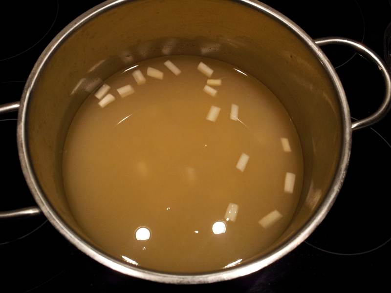 Die beiseite gelegten Bruchstücke in kurze Stücke schneiden und als Einlage dem Sud beigeben. Nochmals 10 min köcheln lassen.