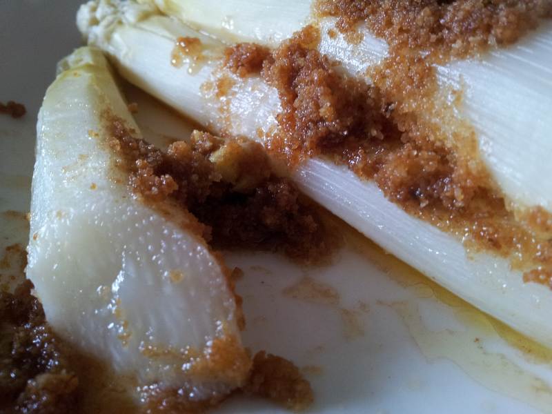 Butter in einer Pfanne bräunen, Semmelbrösel hinzu. Alles über den Spargel geben.
