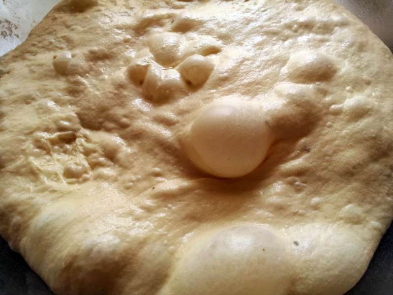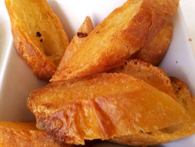 Unmittelbar vor dem Servieren Olivenöl in der Pfanne erhitzen, eine zerdrückte Knoblauchzehe mit hineinlegen (gibt das Aroma ab und verbrennt nicht gleich). Baguette aufschneiden und die Scheiben darin anbraten.
