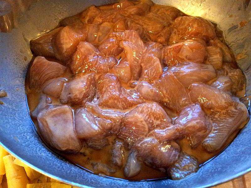 ![]() ![]() Bemerkung: Das Hähnchenfleisch kann nach dem Schneiden mit Eiweiß versiegelt werden. Dadurch wird es besonders zart. Verweise zum Lexikon: Fleisch |
