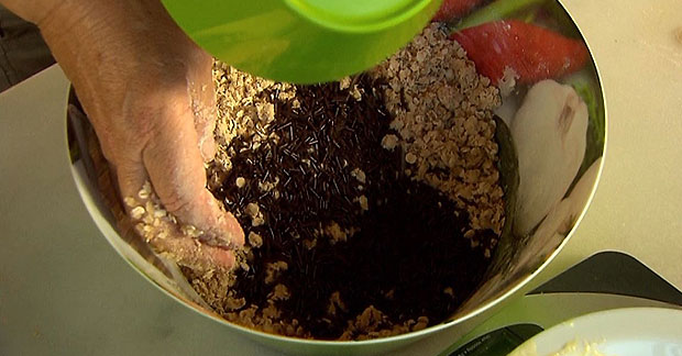 Mehl, Haferflocken, Rohzucker und eine Prise Salz in eine Schüssel geben. Die Butter hinzufügen und die Zutaten mit den Fingern sehr gut vermischen. Es entsteht eine flockige Masse. Dann erst die Schokoladenraspel gut untermischen.