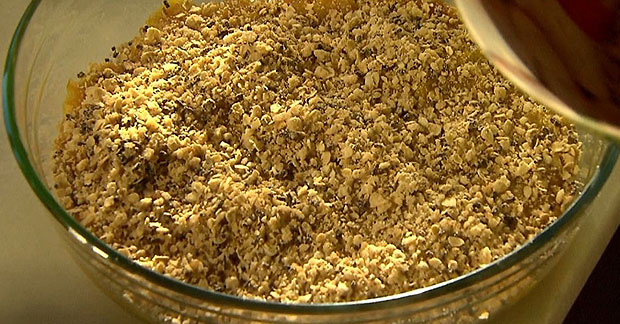 Der „Crumble de Banana“ benötigt etwa 30 Minuten im Ofen bei 210 Grad. Der Haferflockenteig sollte dann knusprig braun aussehen.