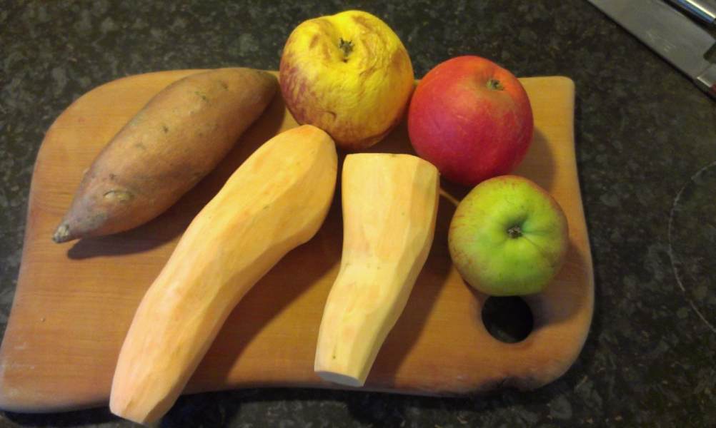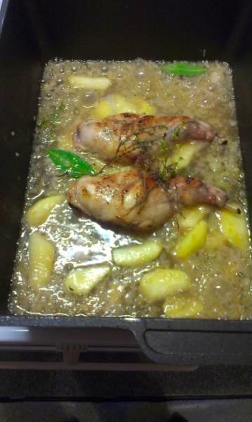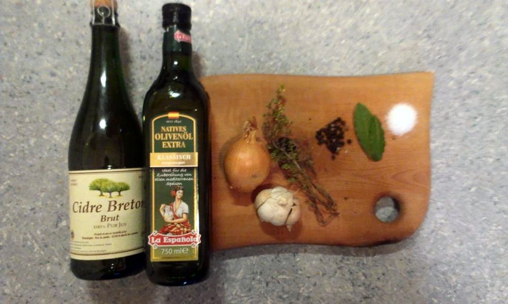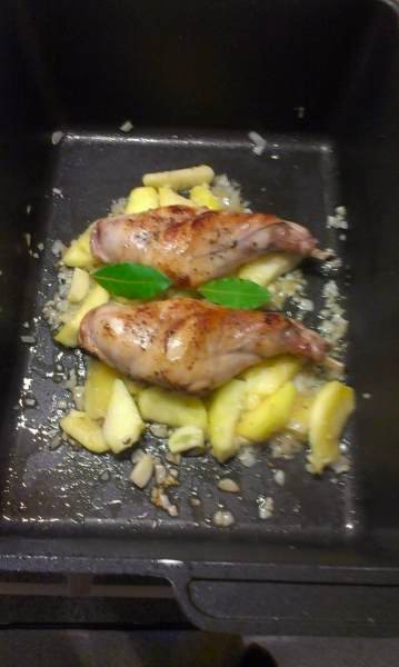 für 4 Personen:Süßkartoffeln4 Kaninchenkeulen (mit Knochen)5 EL Olivenöl2 Gemüsezwiebeln3 Äpfel4-5 Knoblauchzehen2 Lorbeerblätter6 Thymianzweige500 ml Cidre200 ml WasserSalz, Pfeffer