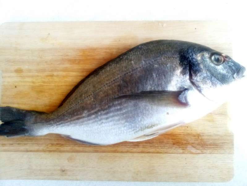 Dorade säubern, die Seitenflossen abschneiden (nicht vergessen wie im BIld). Je nach Größe des Fischs 2..3 x je Seite einschneiden (ziselieren). Dorade würzen mit Pfeffer, Salz. In den Bauchraum und in die Schlitze Kräuter applizieren.