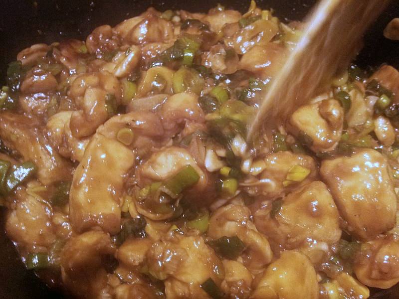 Nun das Hühnerfleisch unter Rühren braten, bis es Farbe nimmt. Lauch, Ingwer und Knoblauch hinzufügen.