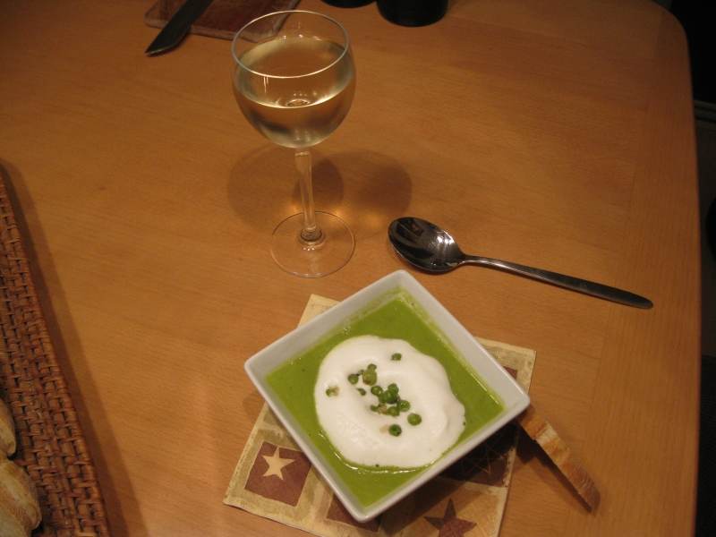 In der Zwischenzeit die Zwiebel schälen, klein schneiden und in Öl anbraten. Den Knobi dazu geben und alles andünsten. Die Erbsen dazugeben und einige Minuten mitdünsten, mit dem Gemüsefond auffüllen und garen. Dann die Erbsen pürieren, die Schlagsahne dazugeben und alles mit dem Pürierstab aufschäumen. Vor dem Pürieren einige Erbsen als Deko zurücklegen.