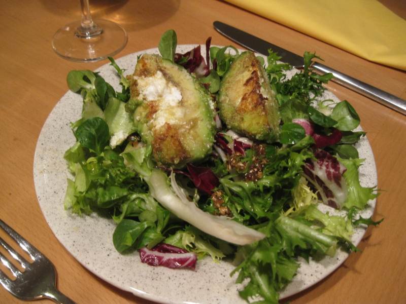 3. Die Avocadoviertel mit der einen Schnittfläche in die gemahlenen Mandeln drücken. Öl/Butter in einer beschichteten Pfanne erhitzen und die Avocadoviertel kurz auf der panierten Seite braten.Man kann auch beide Seiten pannieren und braten. Nicht zu lange, sonst schmilzt der Käse raus.