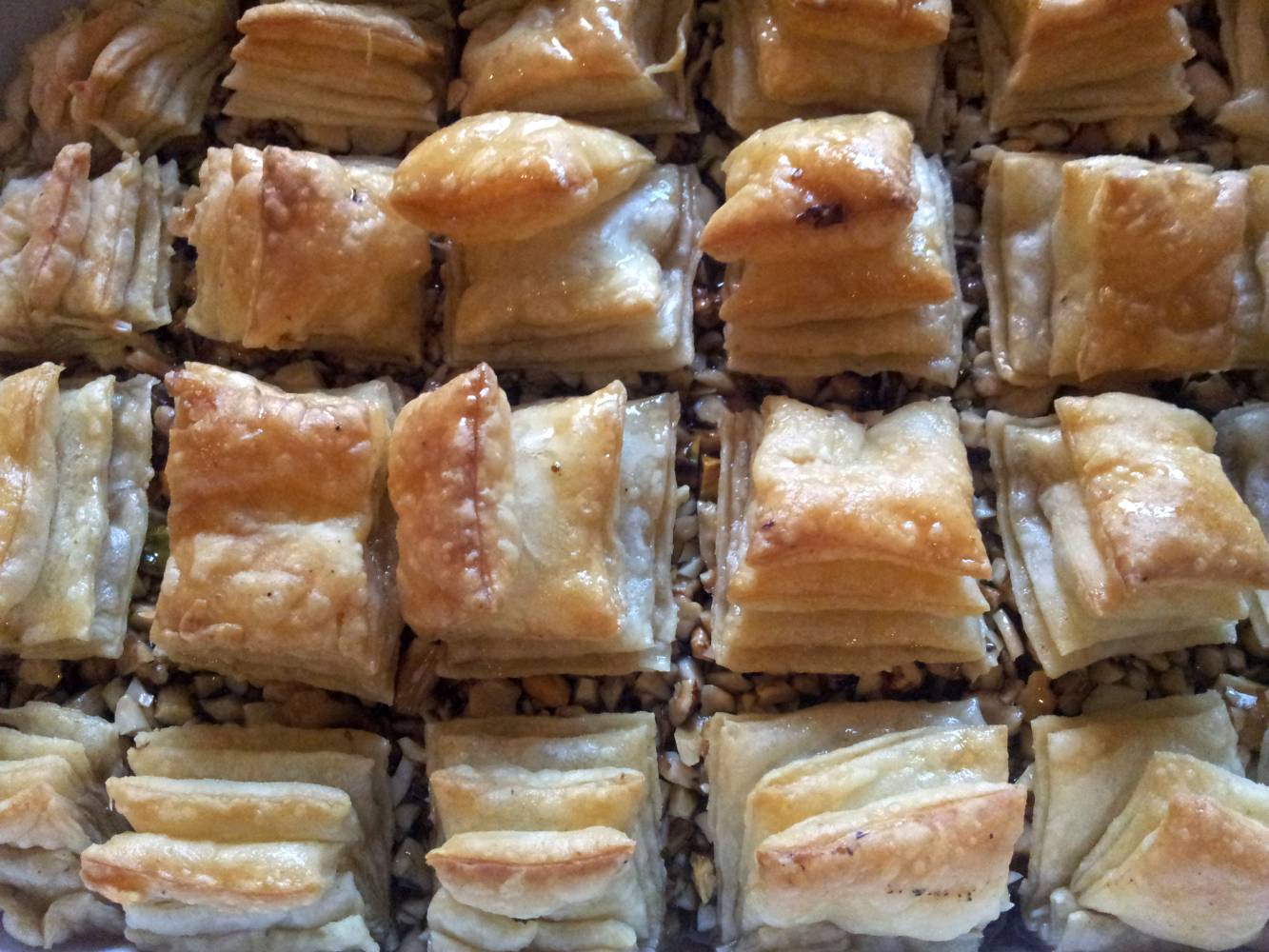 Die erste Hälfte des Teigs Blatt für Blatt übereinander auf das gefettete Backblech legen. Immer zwischen 2 (hauchdünne) Blatt geschmolzene Butter aufstreichen.