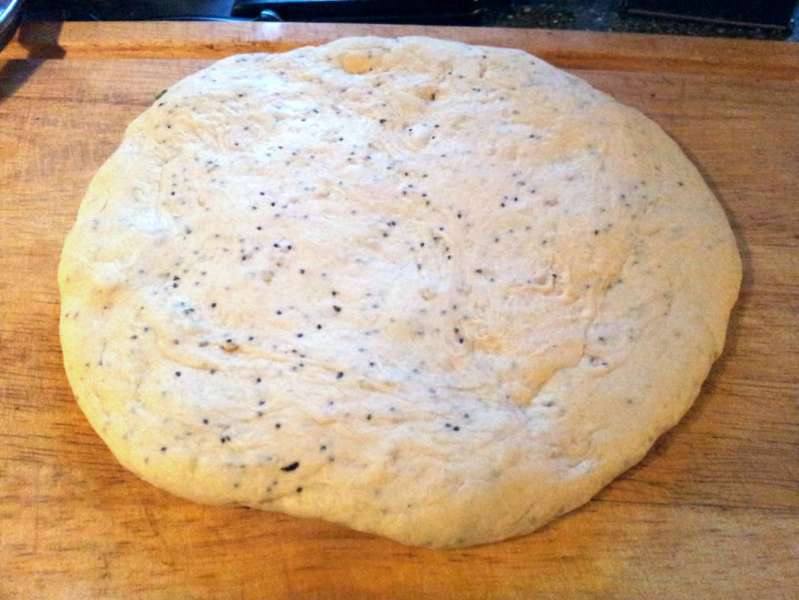 Wenn er beginnt sich von Schüssel und Hand zu lösen, den Teig kneten, bis er elastisch wird. Dabei Sesam und Schwarzkümmel (Mohn) mit einarbeiten.
