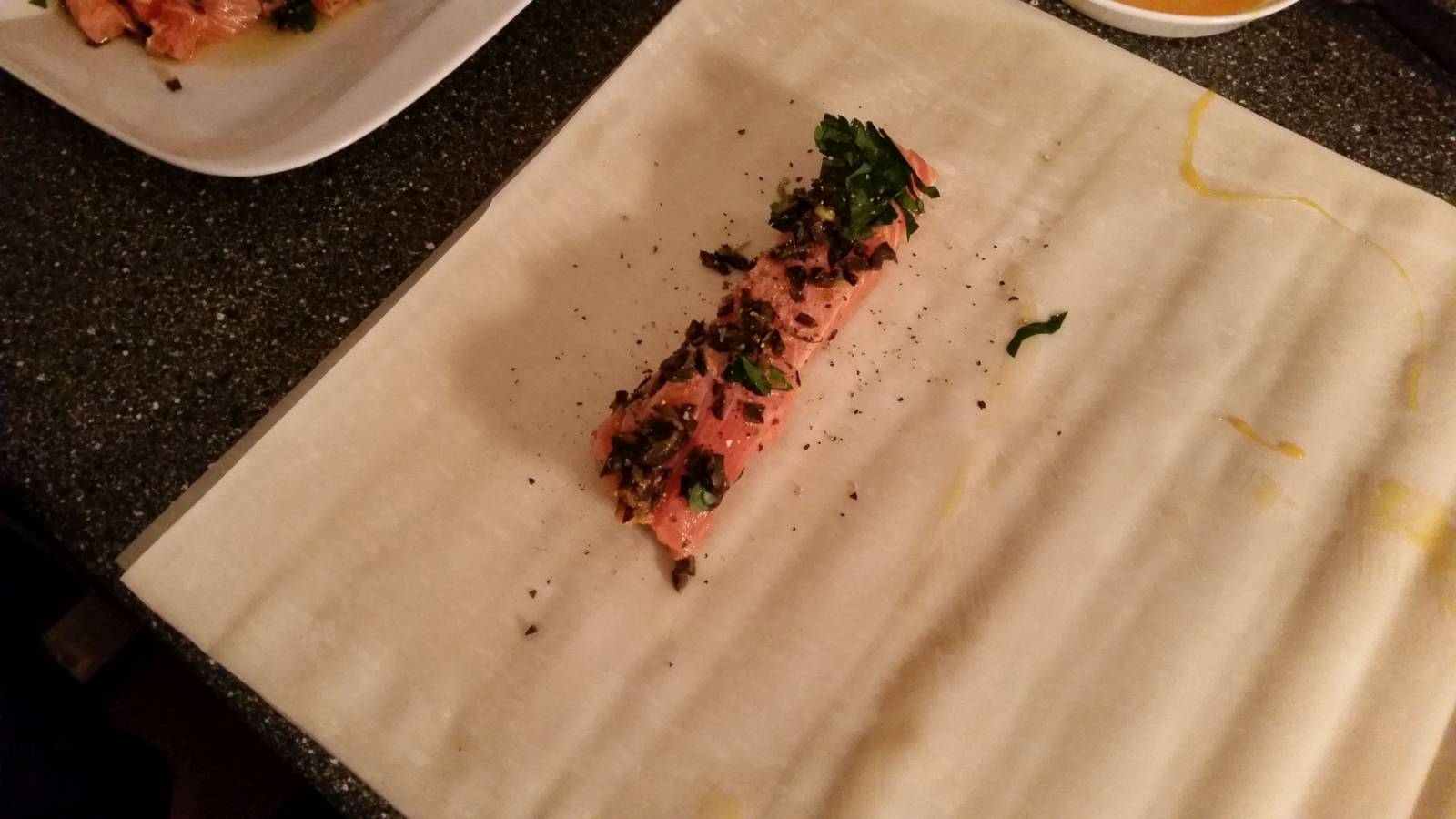 Man benötigt gang, ganz dünnen teig. Eben Frühlibgsrollenteig aus dem Asia-Geschäft, oder eben Filoteig. Den gibt es in jeder größeren Lebensmittelabteilung. Der Teig ist äußerst dünn und eignet sich sehr gut. Ein Blatt auslegen und einen Streifen Lachs, ruhig mit Gewürzen aus der Marinade darin einwickeln. Je nachdem wie der Teigkonsistenz ist, kann gewickelt werden. Die Enden gut verschließen und/oder die Seiten mit Eigelb verkleben.
