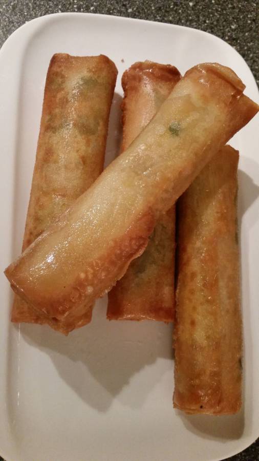 Ein Liter Sonnenblumenöl erhitzen auf ca. 160°C. Hält man einen dünnen Holzstab in das Öl, müssen kleine Bläschen aufsteigen, dann ist das Öl heiß genug. Jetzt die Röllchen paarweise (je nach Topfgröße) dazugebn und warten bis die Röllchen außen schön braun sind. Der Fisch im Inneren braucht nicht lange, um gar zu sein.Entweder man "ofert" ein Röllchen um nachzusehen, oder man hat es im Gefühl ;-)