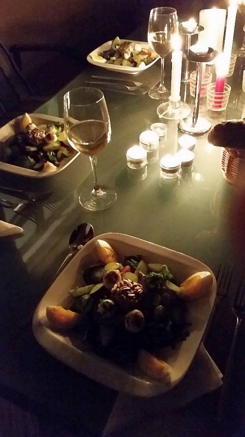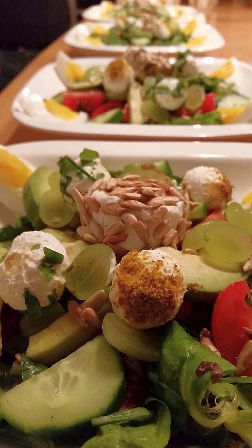 Ein Salatnest auf dem Teller errichten. Darauf die Tomatenviertel kreisförmig anlegen, die 4 Viertel der Eier in den Ecken platzieren, Weintrauben auflegen und abschließend die Ziegenfrischkäsekugeln mittig auf das Nest geben. Evtl übrige Sonneblumenkerne über den Salat streuen (nicht zu viele). | Zubereitung: