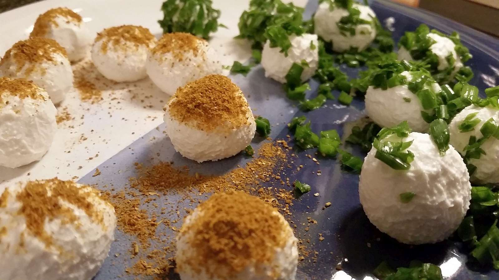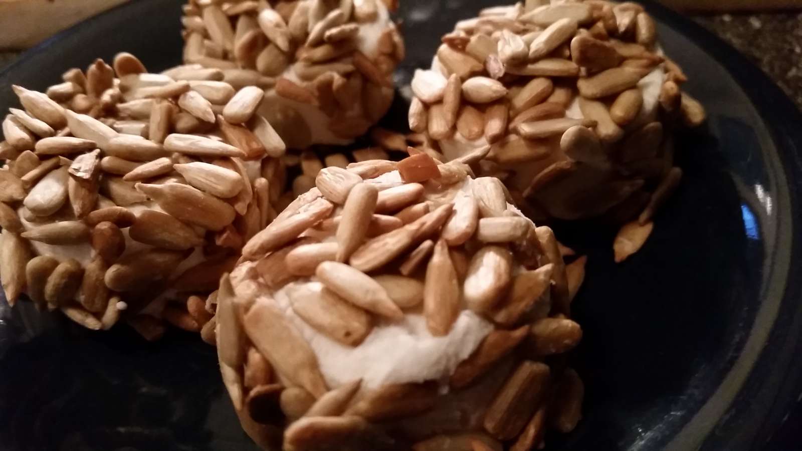 Ziegenfrischkäse zu kleinen Kugeln formen und jew. ein Drittel der Kugeln in den Sonnenblumenkernen, in Curry bzw. gehacktem Schnittlauch wälzen